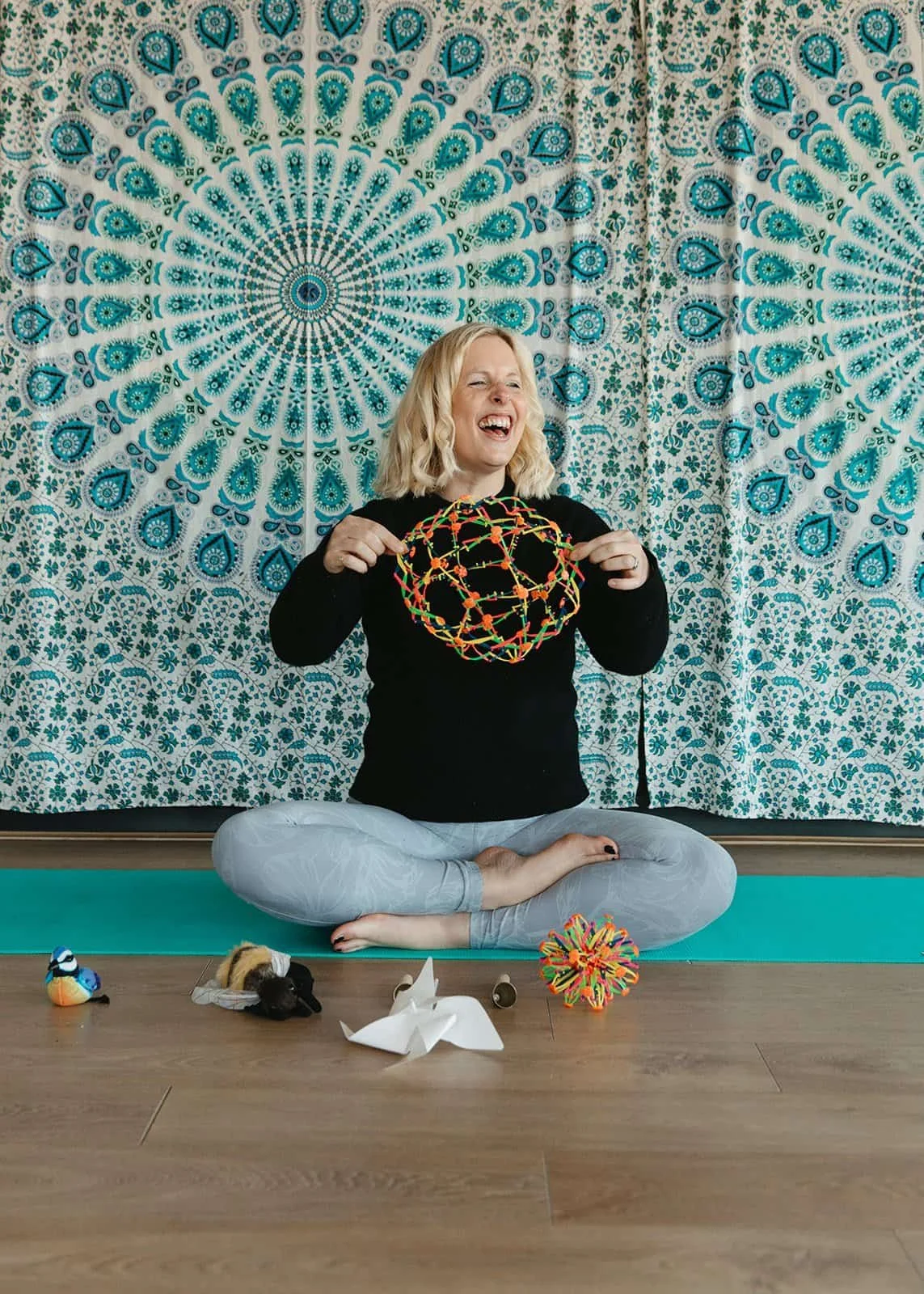 Steph of Jasmine Yoga Tynemouth sitting cross-legged on a yoga mat, smiling and holding a colorful geometric toy, with a tapestry featuring a blue and white mandala pattern behind her and various toys on the floor.